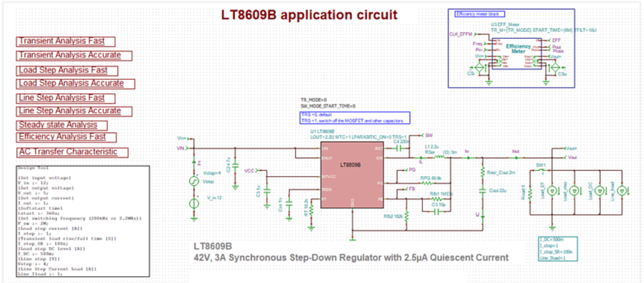 TINA includes many switched-mode power supply models from leading manufacturers-such as Texas Instruments, Infineon Technologies, Analog Devices, Nisshinbo Micro Devices, Würth Elektronik, STMicroelectronics, Semtech and more. Most of these converters are available as a single unified model that supports Transient, Line-Step, Load-Step, AC Analysis, Efficiency-vs-load plots, and automatic redesign to user-defined specifications-all within the same model.