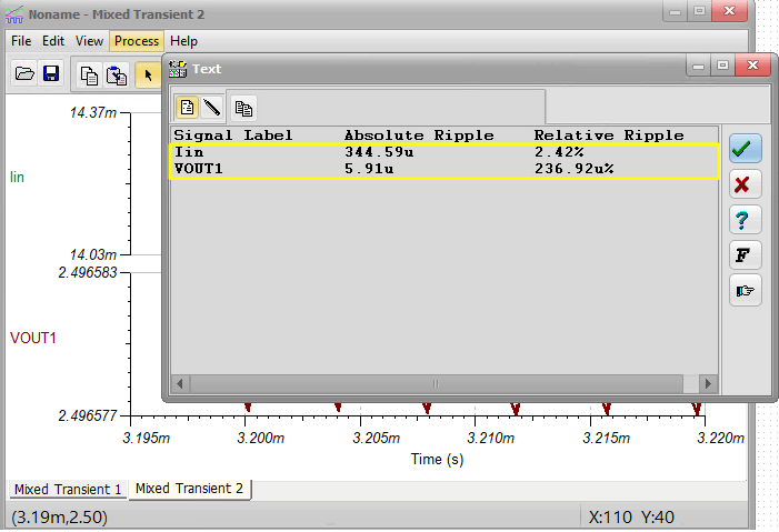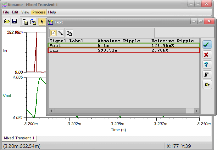 We calculate the ripple in the input current (Iin) and the output voltage (Vout). By running a Transient Analysis in TINA, the steady-state operating waveforms appear. To get the numerical values, select Ripple… from the Process menu of the Diagram window. This calculates and displays the absolute and relative ripple values.