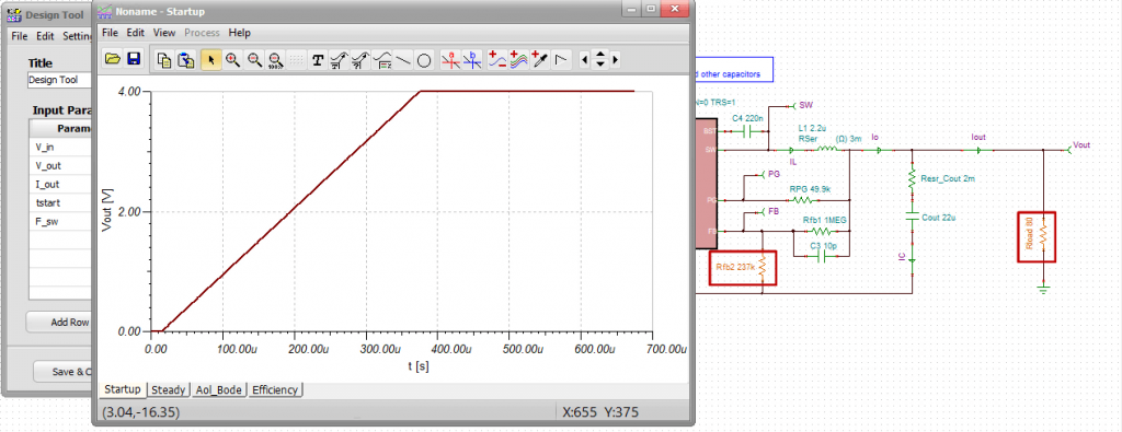 Using the Design Tool in TINA, we set the required output voltage (Vout) to 4 V. Once the value is entered, pressing Run executes the quick analytic calculation, and the necessary component changes are instantly applied to the displayed circuit.