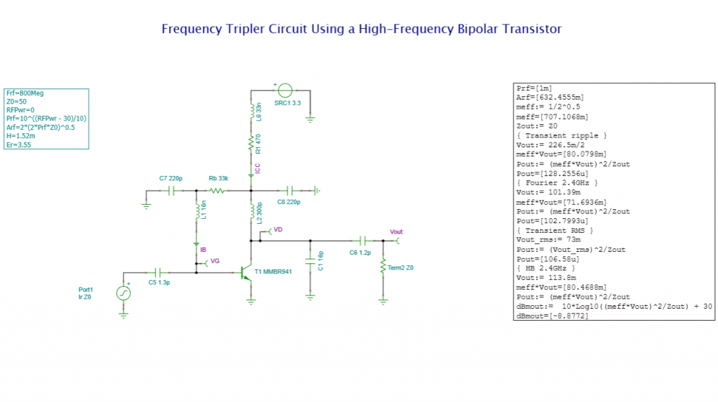 Circuit Overview: This frequency tripler circuit generates a 2.4 GHz output signal, exactly three times the 800 MHz input frequency, using a high-frequency bipolar transistor (MMBR941).