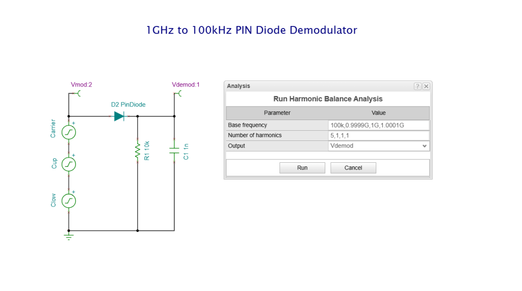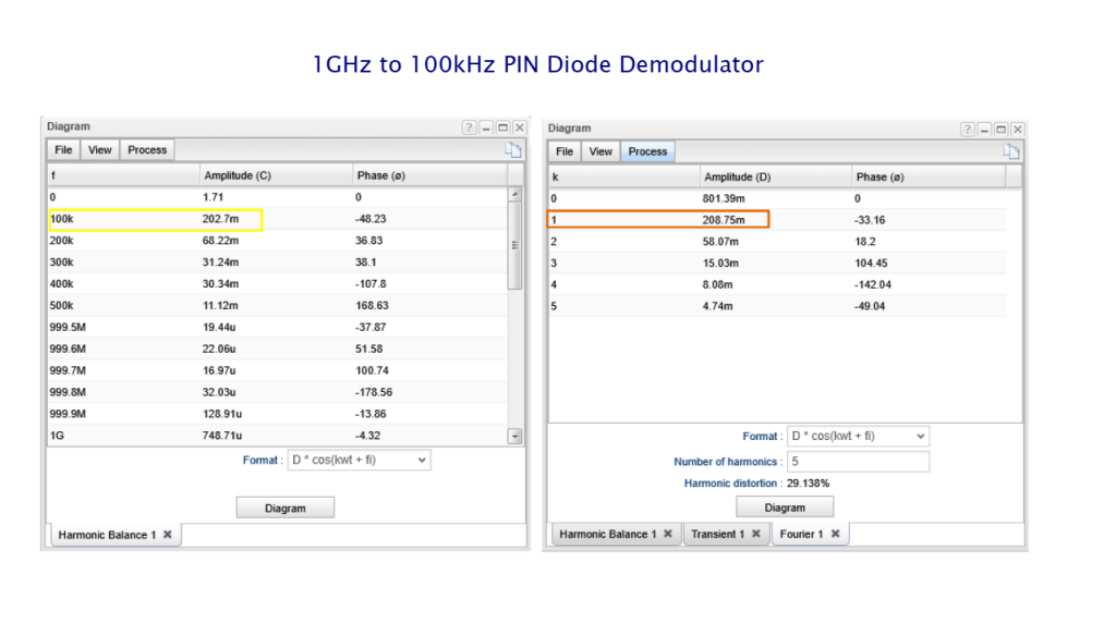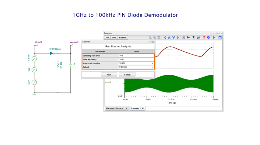 AM Demodulator with PIN Diode circuit: Harmonic Balance and Fourier Analysis