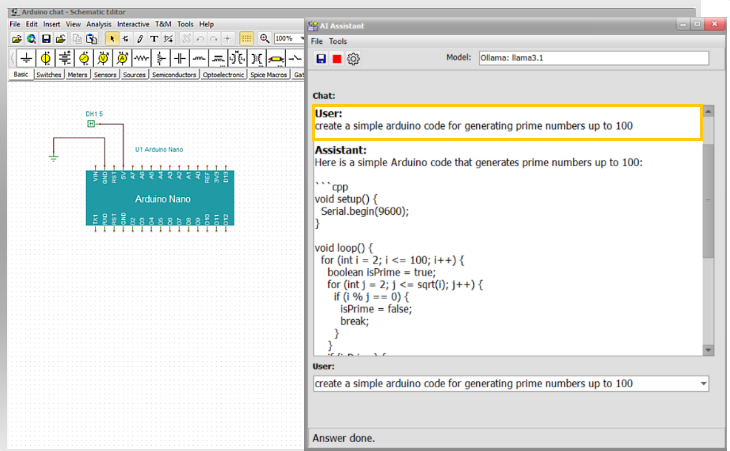- Arduino Code Generation: Request the AI to “Create a simple Arduino code for generating prime numbers up to 100,” then compile and verify the results using TINA’s Serial Monitor.