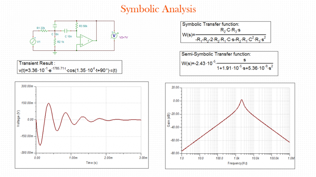 Another unique feature of TINA is the Symbolic Analysis capability. This produces the closed-form expression of the transfer function, equivalent resistance, impedance, or response of analog linear networks.