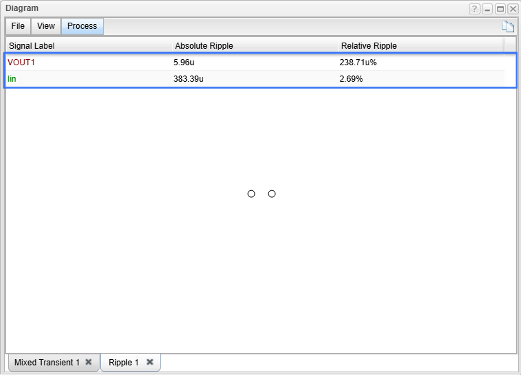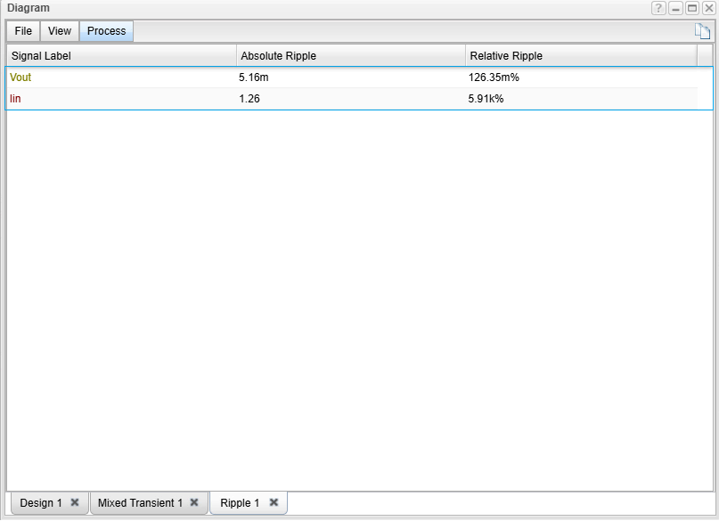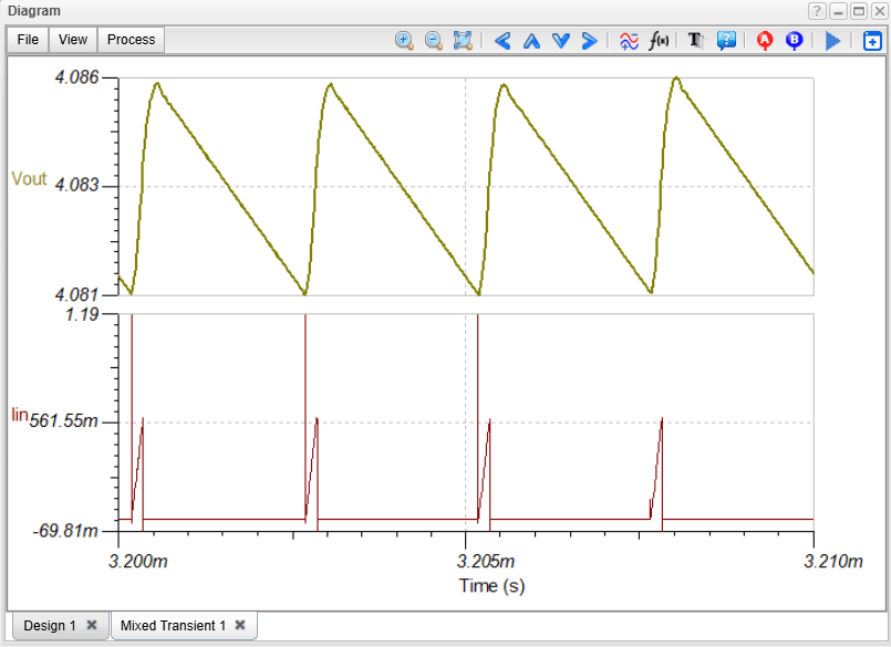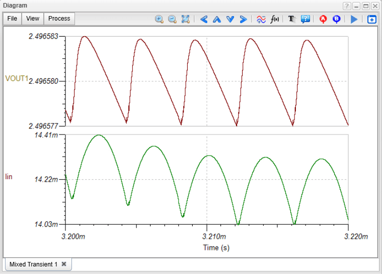 We calculate the ripple in the input current (Iin) and the output voltage (Vout). By running a Transient Analysis in TINACloud, the steady-state operating waveforms appear. To get the numerical values, select Ripple… from the Process menu of the Diagram window. This calculates and displays the absolute and relative ripple values.
