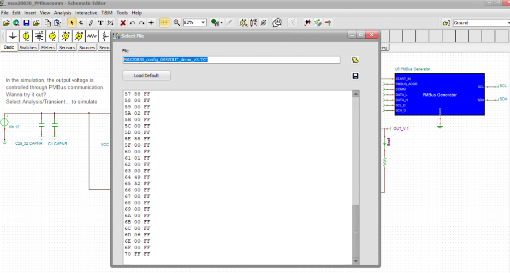 Open the MAX20830 PMBus TSC file located in the TINA Examples\Analog Devices\MAX20830 folder.