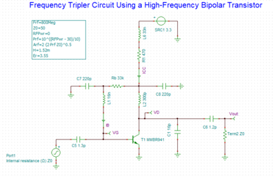 This frequency tripler circuit generates a 2.4 GHz output signal, exactly three times the 800 MHz input frequency, using a high-frequency bipolar transistor (MMBR941).