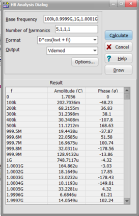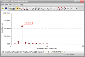 As described previously, in this case we specify only the three known frequencies in the HB Analysis dialog, rather than calculating all spectrum lines from the base frequency, since this would otherwise require calculating 10,000 spectrum lines. However, for the 100 kHz base frequency we require the calculation of five spectrum lines due to the distortion introduced