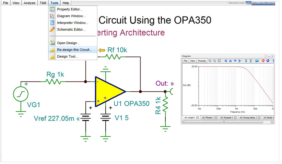 Design Tool works with the design equations of your circuit to ensure that the specified inputs result in the specified output response. The tool requires of you a statement of inputs and outputs and the relationships among the component values. The tool offers you a solution engine that you can use to solve repetitively and accurately for various scenarios. The calculated component values are automatically set in place in the schematic and you can check the result by simulation.