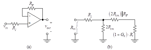 Figure 29(a) illustrates the non-inverting amplifier, and Figure 29(b) shows the equivalent circuit.